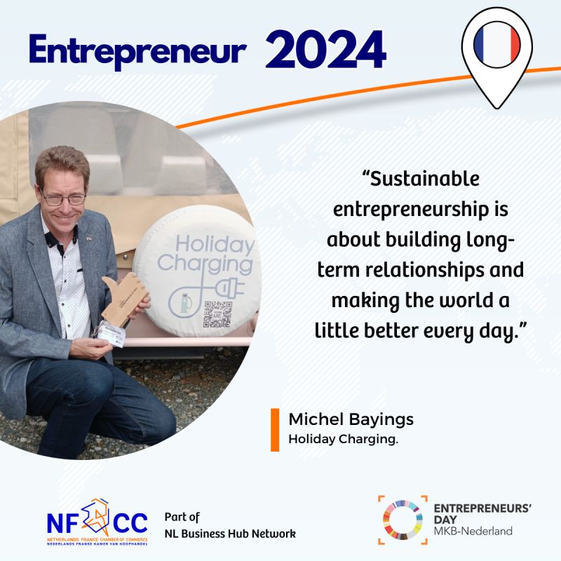 On Entrepreneur’s Day in the Netherlands, celebrated globally for the first time in 2024, the NL Business Hub Network highlighted 14 entrepreneurs exemplifying sustainable business practices. The Chambre de Commerce et d’Industrie des Pays-Bas en France selected Michel Bayings, founder of Holiday Charging, for his pioneering work in sustainable mobility and EV charging solutions in France. Michel’s achievements showcase innovation, resilience, and a commitment to reducing the carbon footprint of travel.